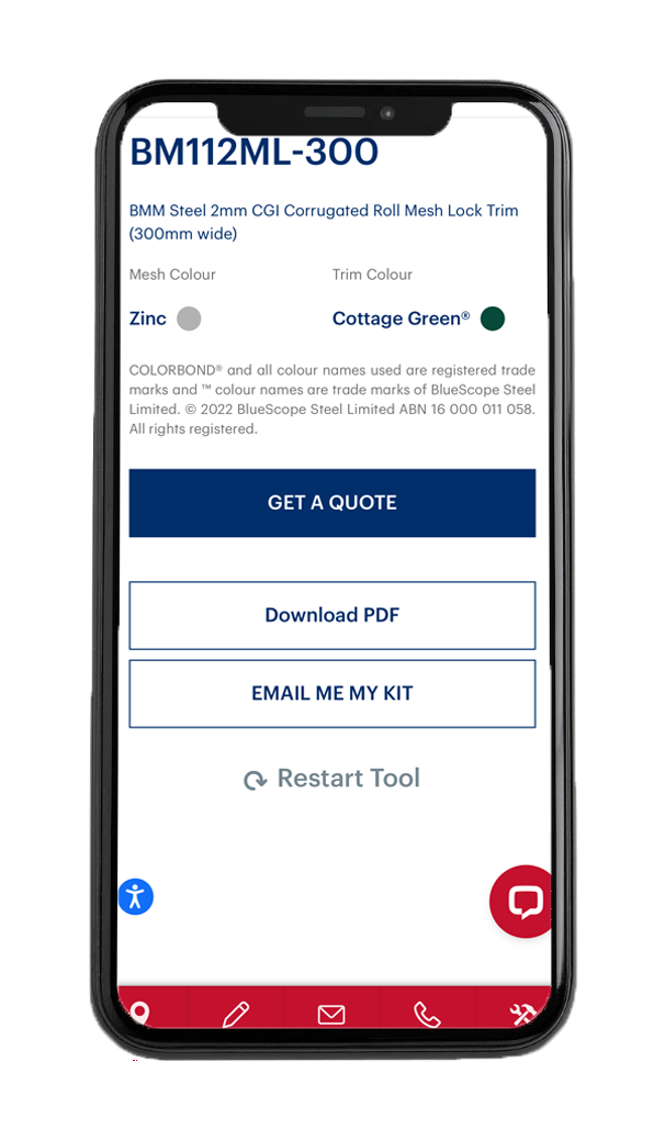 Once you have generated a mesh kit, you can easily request a quote, email yourself your kit or download a PDF and print it out to take into your local Stratco store.